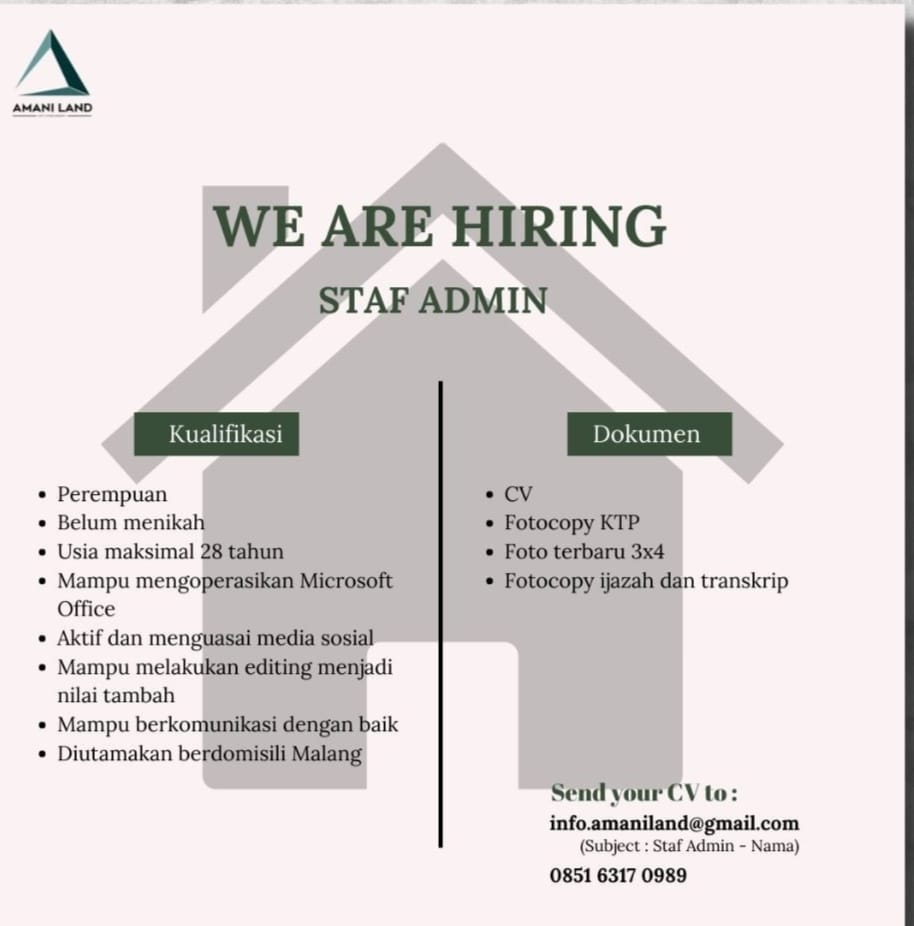 Saat ini Amani Land sedang membuka lowongan kerja staff admin dengan kualifikasi sebagai berikut :?