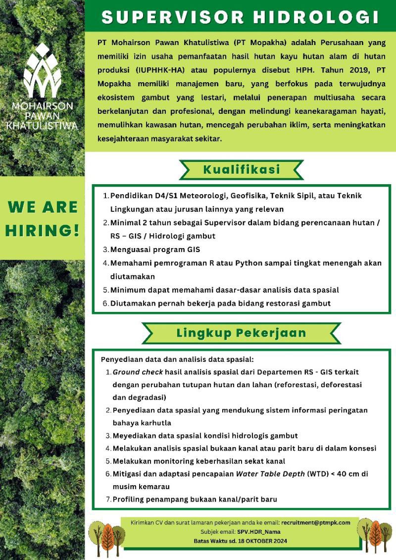 Saat ini PT. Mohairson Pawan Khatuliswa sedang membuka lowongan kerja supervisor hidrologi dengan kualifikasi sebagai berikut :?