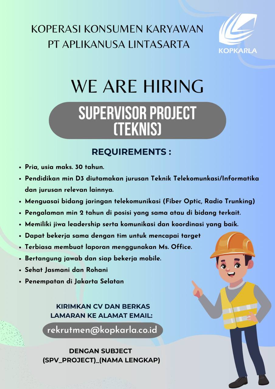 Saat ini PT. Aplikanusa Lintasarta sedang membuka lowongan kerja supervisor project ( teknisi ) dengan kualifikasi sebagai berikut?