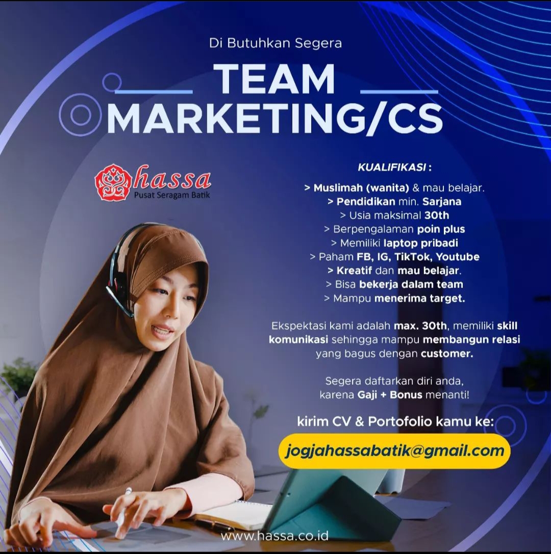 Saat ini Hassa Batik sedang membuka lowongan pekerjaan team marketing / CS dengan kualifikasi sebagai berikut :