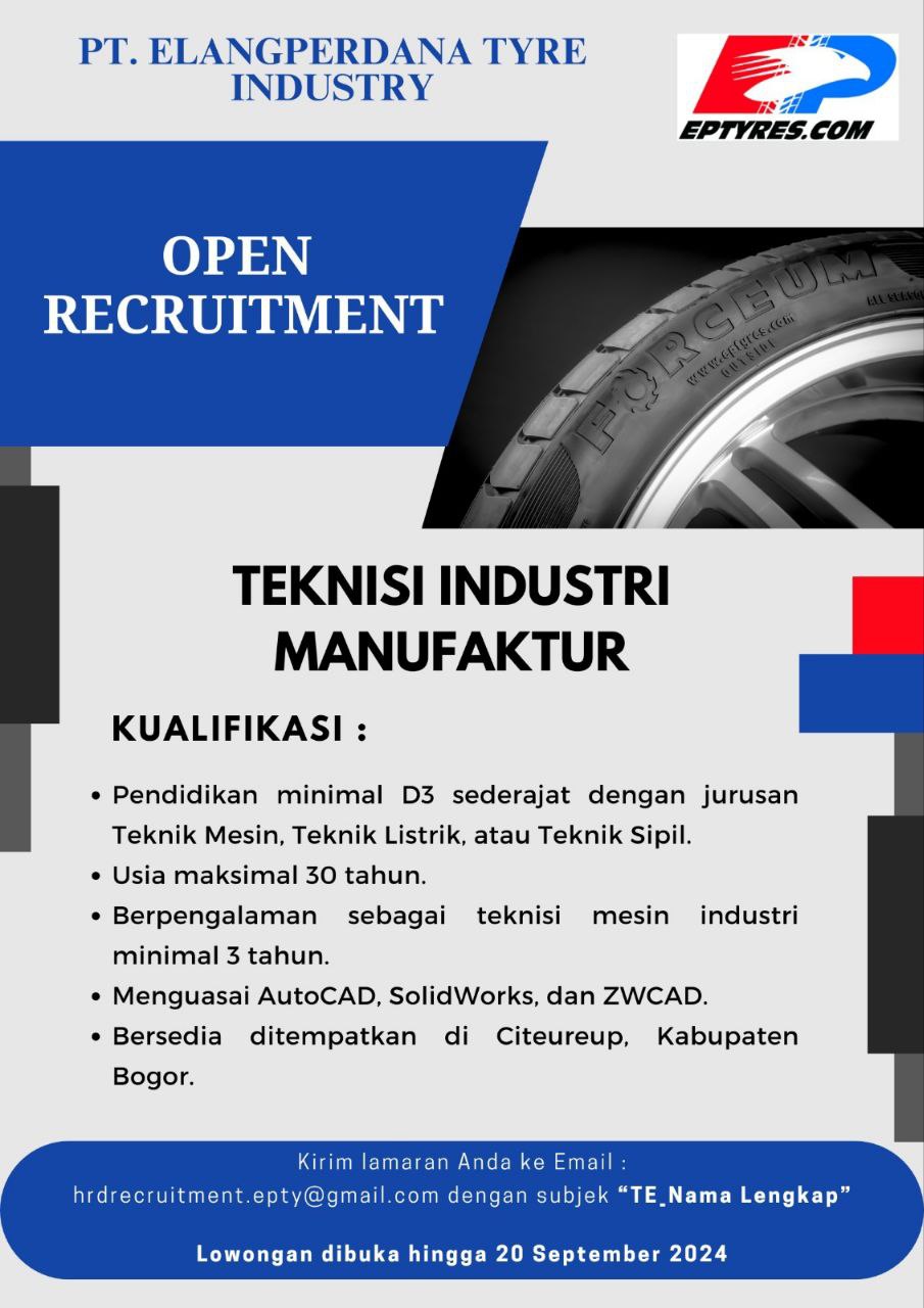 Lowongan Kerja Teknisi Industri Manufaktur di PT. Elangperdana Tyre Insdustry 2024