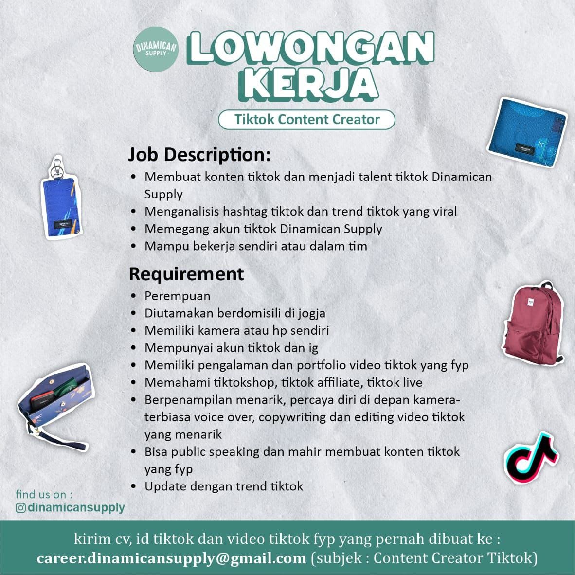 Saat ini Dinamican Supply sedang membuka lowongan pekerjaan sebagai Tiktok Content Creator dengan kualifikasi sebagai berikut:?
