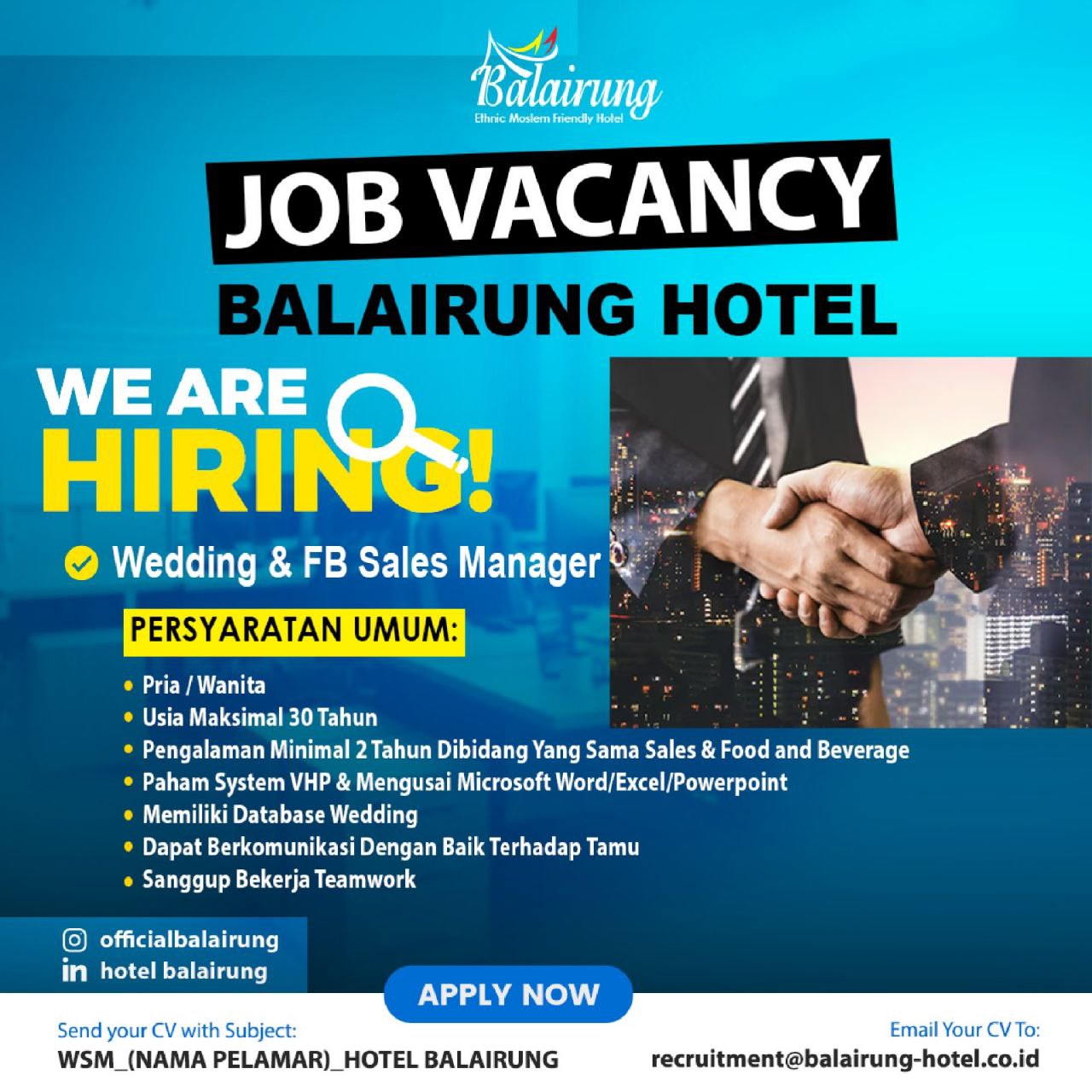 Jika anda berminat dengan lowongan kerja ini, segera kirimkan lamaran anda ke email : recruitment@balairung-hotel.co.id