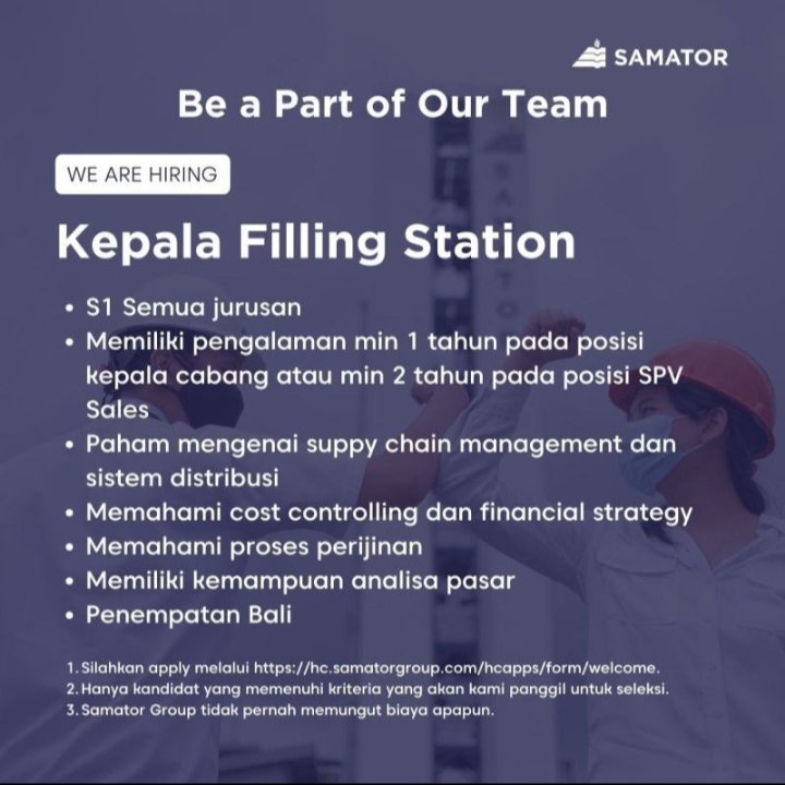 PT Samator, sedang membuka lowongan pekerjaan untuk posisi Kepala Filling Station sebagai berikut:
