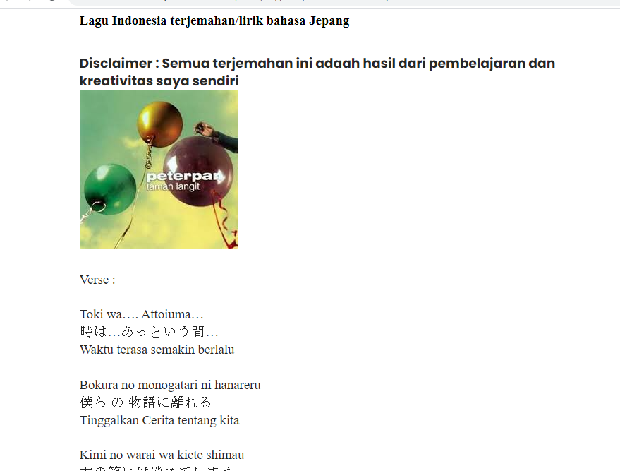 2. Untuk bahasa Jepang yaitu membuat semacam projek penerjemahan lagu Indonesia ke bahasa Jepang (dan sebaliknya). Ditambah ada detail grammar di setiap lagu yang saya namakan "bedah lagu *bla *bla", darisana kemampuan bahasa jepang Saya bertambah. Saya juga menyediakan terjemahan lagu barat ke bahasa Jepang (dan sebaliknya).